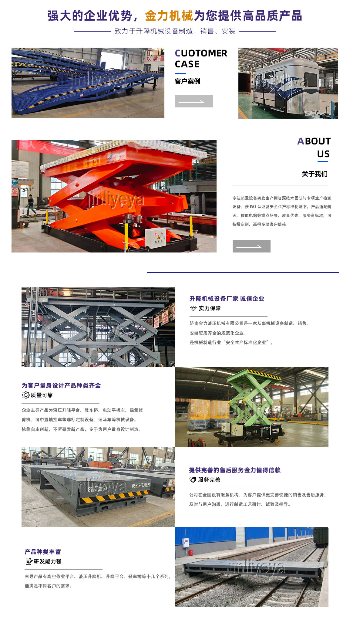 關(guān)于我們濟(jì)南金力液壓機(jī)械有限公司介紹 濟(jì)南金力液壓機(jī)械有限公司是濟(jì)南市高新技術(shù)企業(yè),質(zhì)量、信譽(yù)雙保單位,重合同守信用單位。工廠始建于1958年,于2004年改制,占地面積30000平方米,注冊(cè)資金5000萬元,建筑面積15000平方米,在各級(jí)組織和主管部門正確領(lǐng)導(dǎo)下,先后成立了基層組織和工會(huì)組織。公司團(tuán)隊(duì)帶領(lǐng)廣大員工,以科學(xué)發(fā)展觀為統(tǒng)領(lǐng),加強(qiáng)企業(yè)思想政治工作,以組織建設(shè)推動(dòng)發(fā)展。依靠科技進(jìn)步,強(qiáng)化管理促進(jìn)創(chuàng)新,聚焦質(zhì)量穩(wěn)固生存根基,轉(zhuǎn)方式,調(diào)結(jié)構(gòu),以創(chuàng)新驅(qū)動(dòng)整體工作推進(jìn),把創(chuàng)新作為企業(yè)發(fā)展的生命線。 公司重視知識(shí)產(chǎn)權(quán)的保護(hù)和自主創(chuàng)新,不斷提高研發(fā)能力。申報(bào)國家發(fā)明zhuanli四項(xiàng):電動(dòng)旋轉(zhuǎn)垂直升降式立體車庫、一種操作面積可變的升降平臺(tái)、一種抗爆容器支撐調(diào)節(jié)平臺(tái)、一種掛車;實(shí)用技術(shù)zhuanli若干項(xiàng)包括:車載式綠籬修剪機(jī)、快速伸縮式鐵路跨橋、升降平臺(tái)安全穩(wěn)定裝置、低壓軌道供電電動(dòng)平車、雙速電機(jī)電動(dòng)平車、機(jī)車分離式快速掛接升降平臺(tái)...